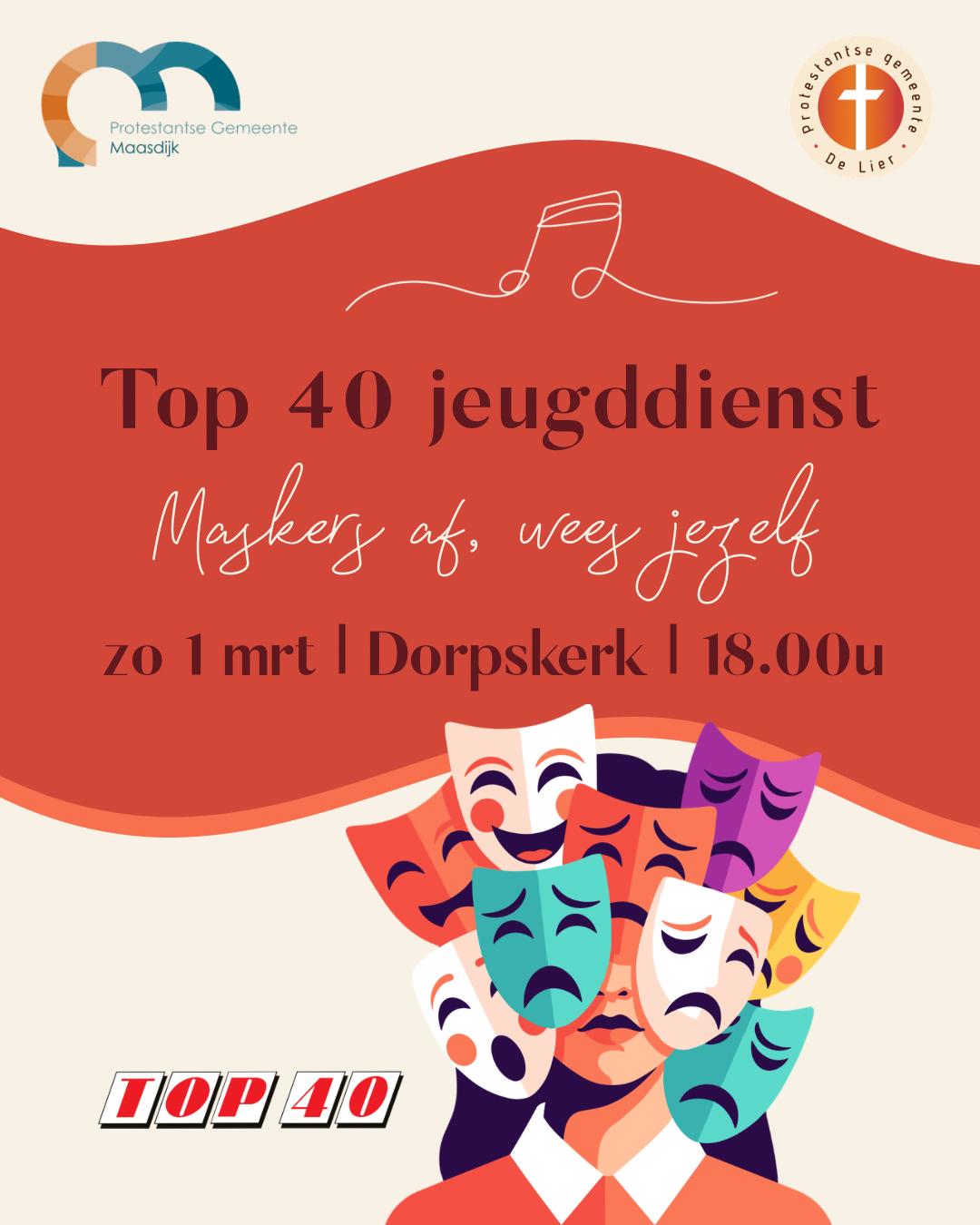 Op zondagavond 1 maart organiseren we een Top40-dienst in de Dorpskerk, speciaal gericht op tieners én jongeren van verschillende leeftijden. En het is een Top40-dienst, dus ook als veertiger of ietsjes ouder ben je nog van harte welkom!